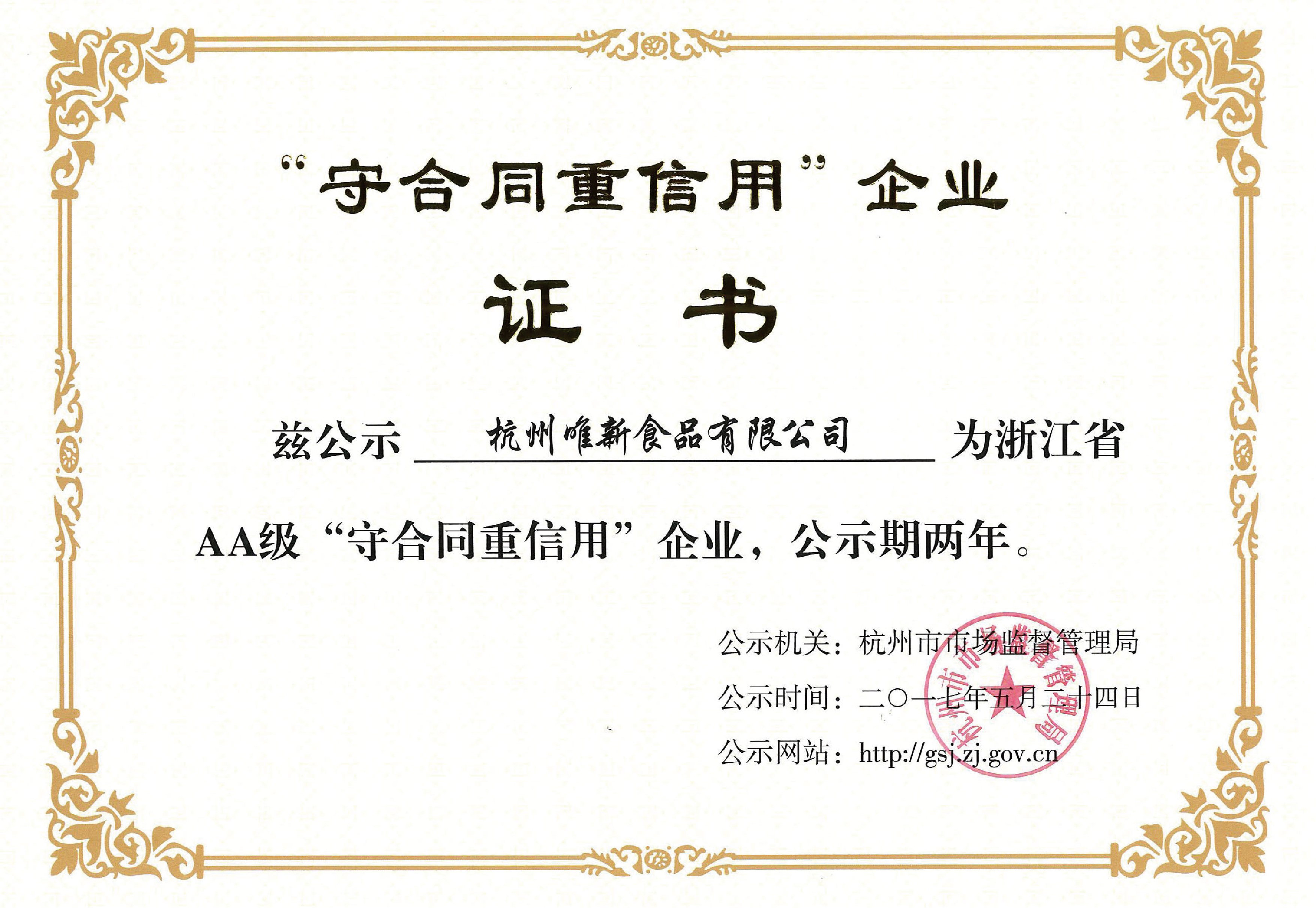浙江省AA級“守合同 重信用”企業(yè)